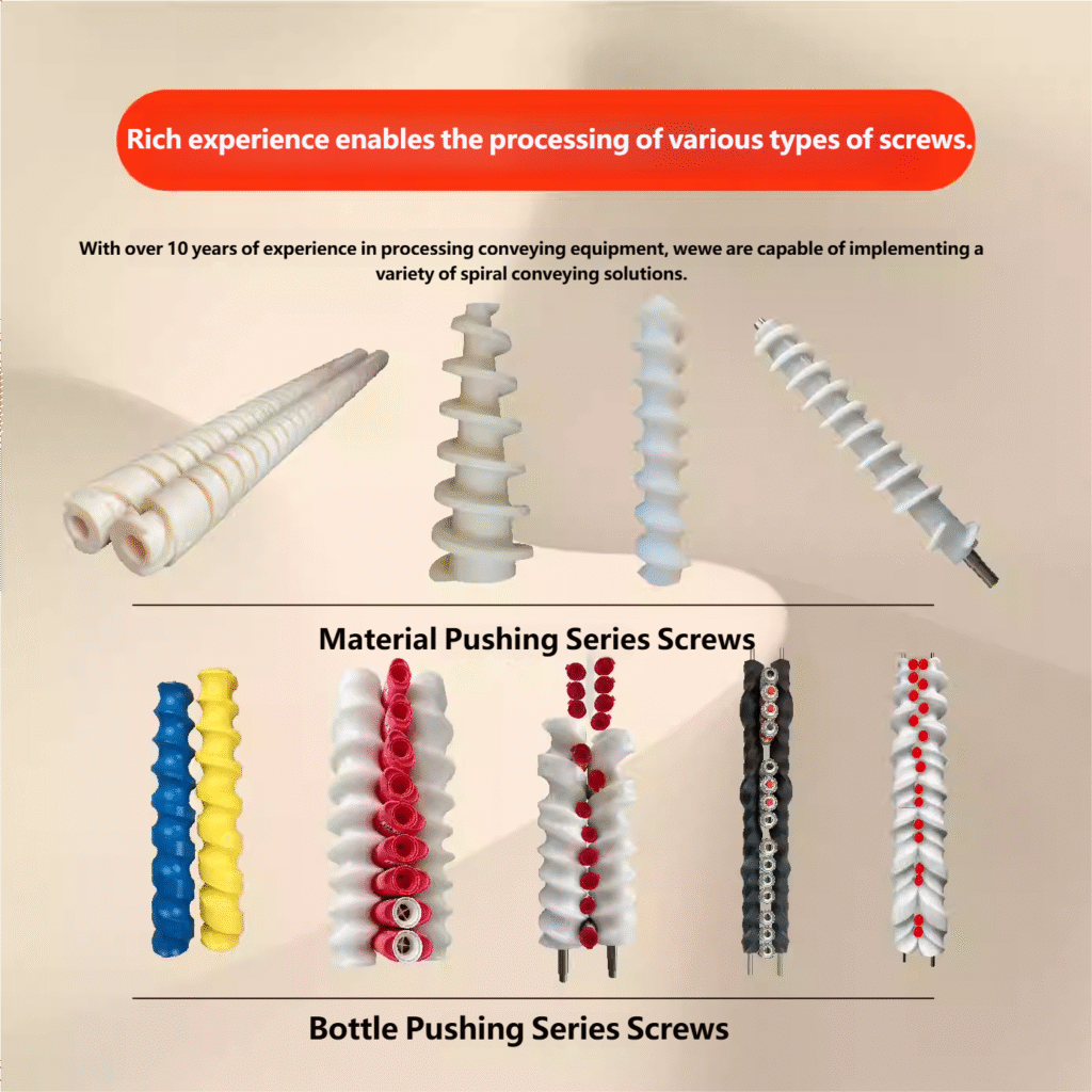 - Flexible and Changeable: According to the needs of different bottle types, specifications and production capacities, screws with different pitches, sizes and materials can be customized. From beverages and sauces to daily chemicals and pharmaceuticals, it can be perfectly adapted and is the cornerstone of a flexible production line.