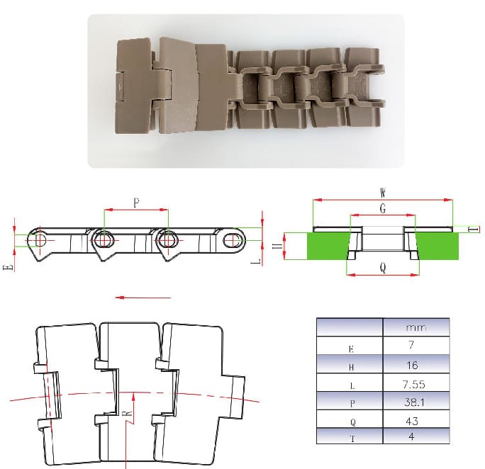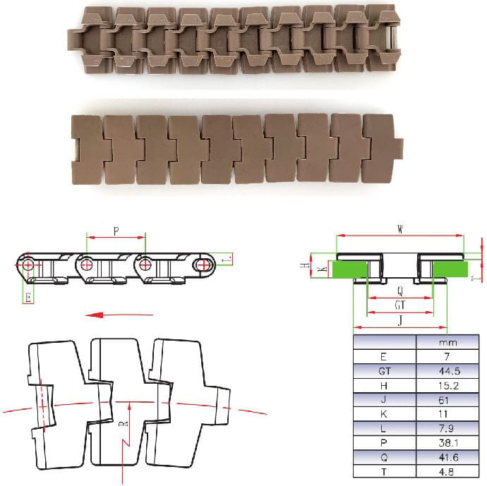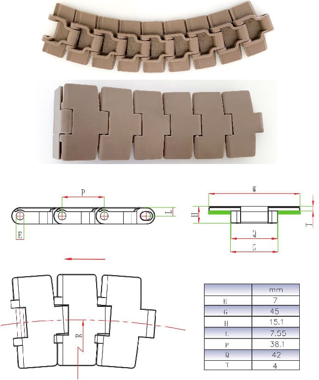 | Chain model | width(mm) | weight(kg/m) | Reverse bending radius | Turning radius |