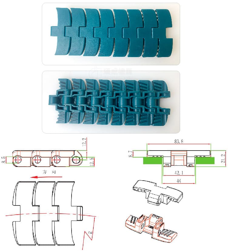 | Chain model | width(mm) | weight(kg/m) | Reverse bending radius | Turning radius |