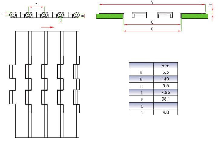 | Chain model | width(mm) | weight(kg/m) | Q value(mm) | Reverse bending radius |