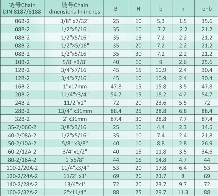 T-type double row chain guide rail parameter table